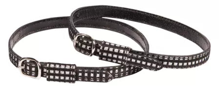 Spoorriempjes met polkadot print in zilver. Mooie gespsluiting en brede passanten. Stijlvol en trendy. lengte is 47cm.
