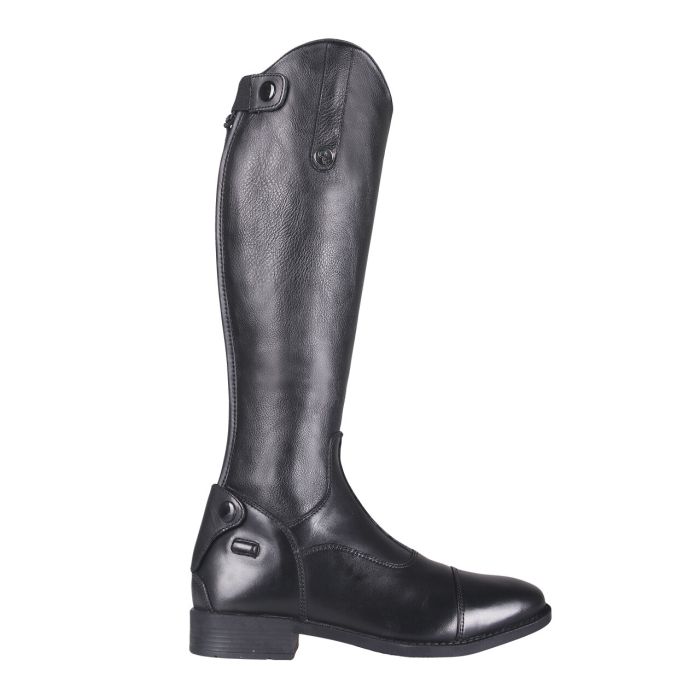 Stoere rijlaars van QHP. Deze rijlaars heeft een moderne nauwsluitende pasvorm. Dit model heeft een middelhoge boog. De rijlaars heeft een grove structuur op de schacht. Aan de rits zit een vetertje. De buitenzijde van de kuit is van elastisch imitatieleer, de binnenkant van de kuit en de voet zijn van echt leer.