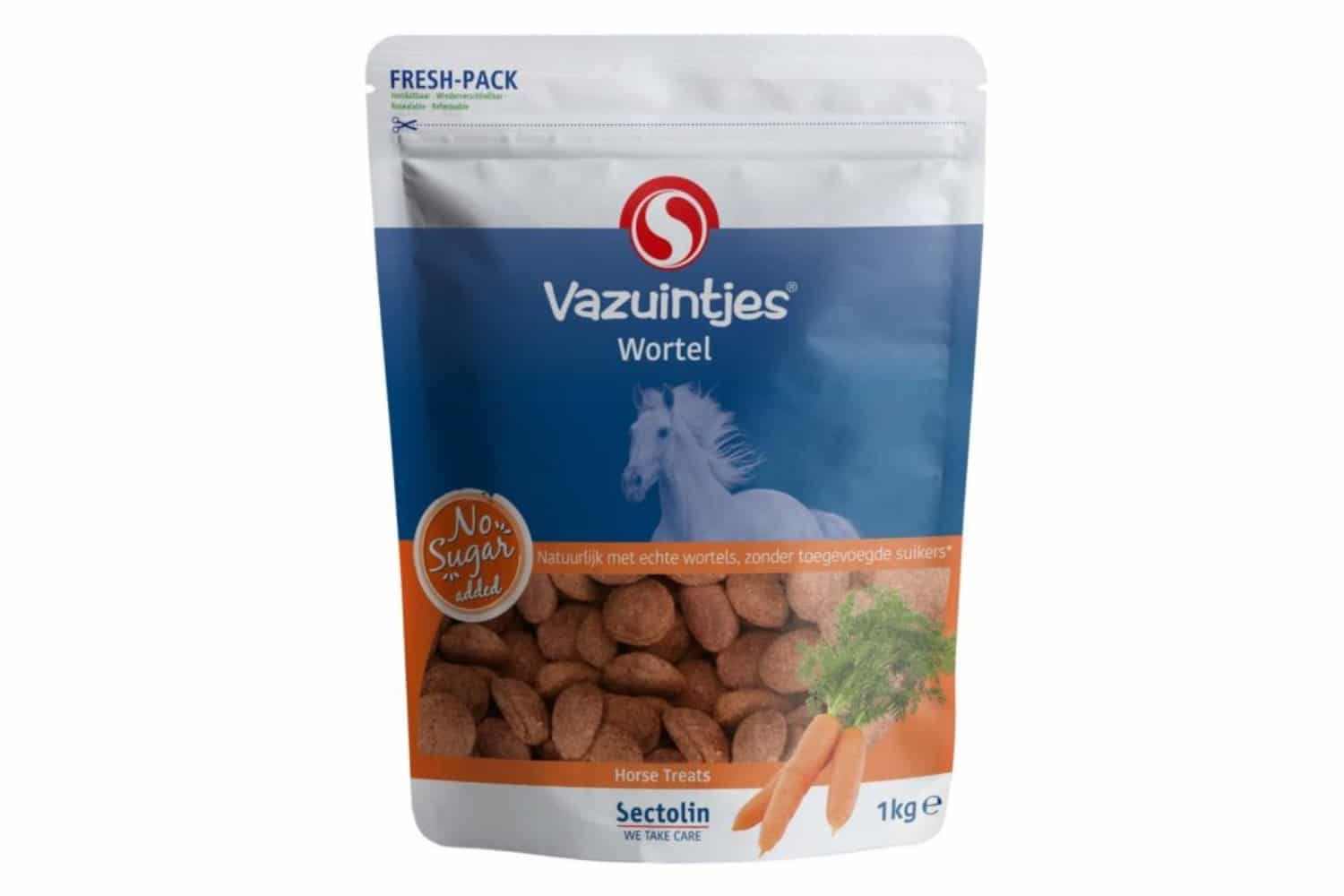 Sectolin Vazuintjes Wortel zijn smakelijke paardensnoepjes met echte wortels. Een smakelijke beloning voor je paard of pony. Vazuintjes Wortel is een aanvullend diervoeder voor paarden.